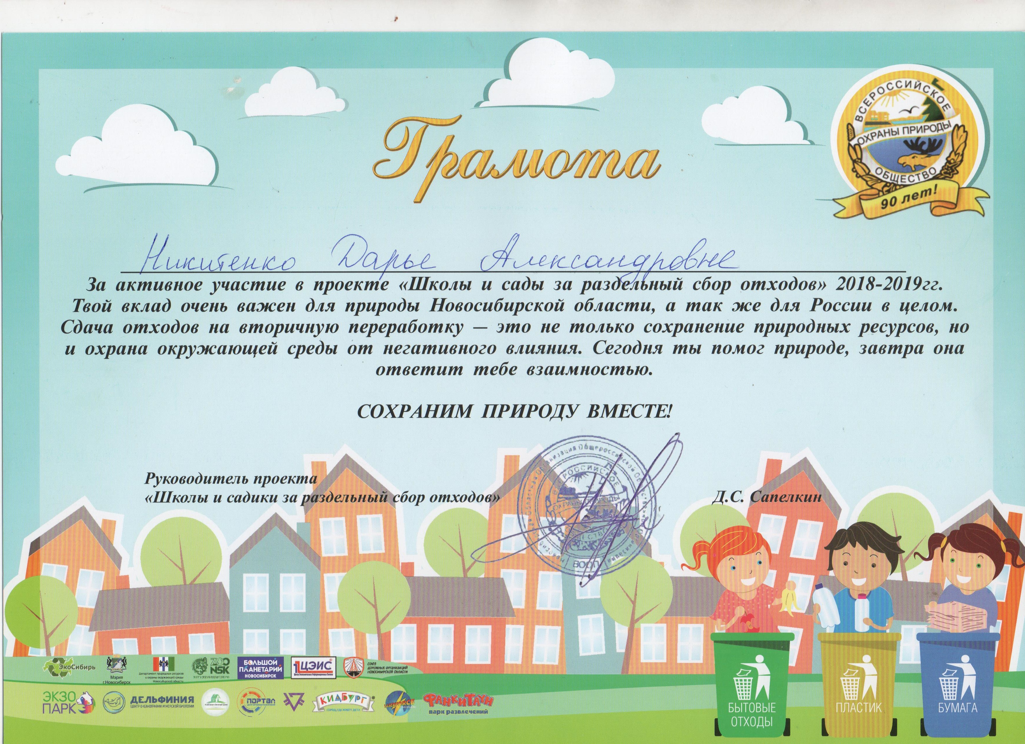 Грамота за активное участие в проекте «Школы и сады за раздельный сбор отходов» 2019-2020»