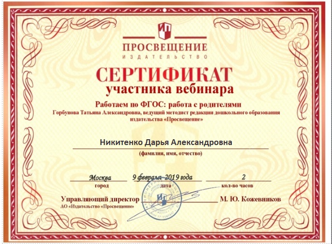 Сертификат участника вебинара «Работа по ФГОС: работа с родителями»
