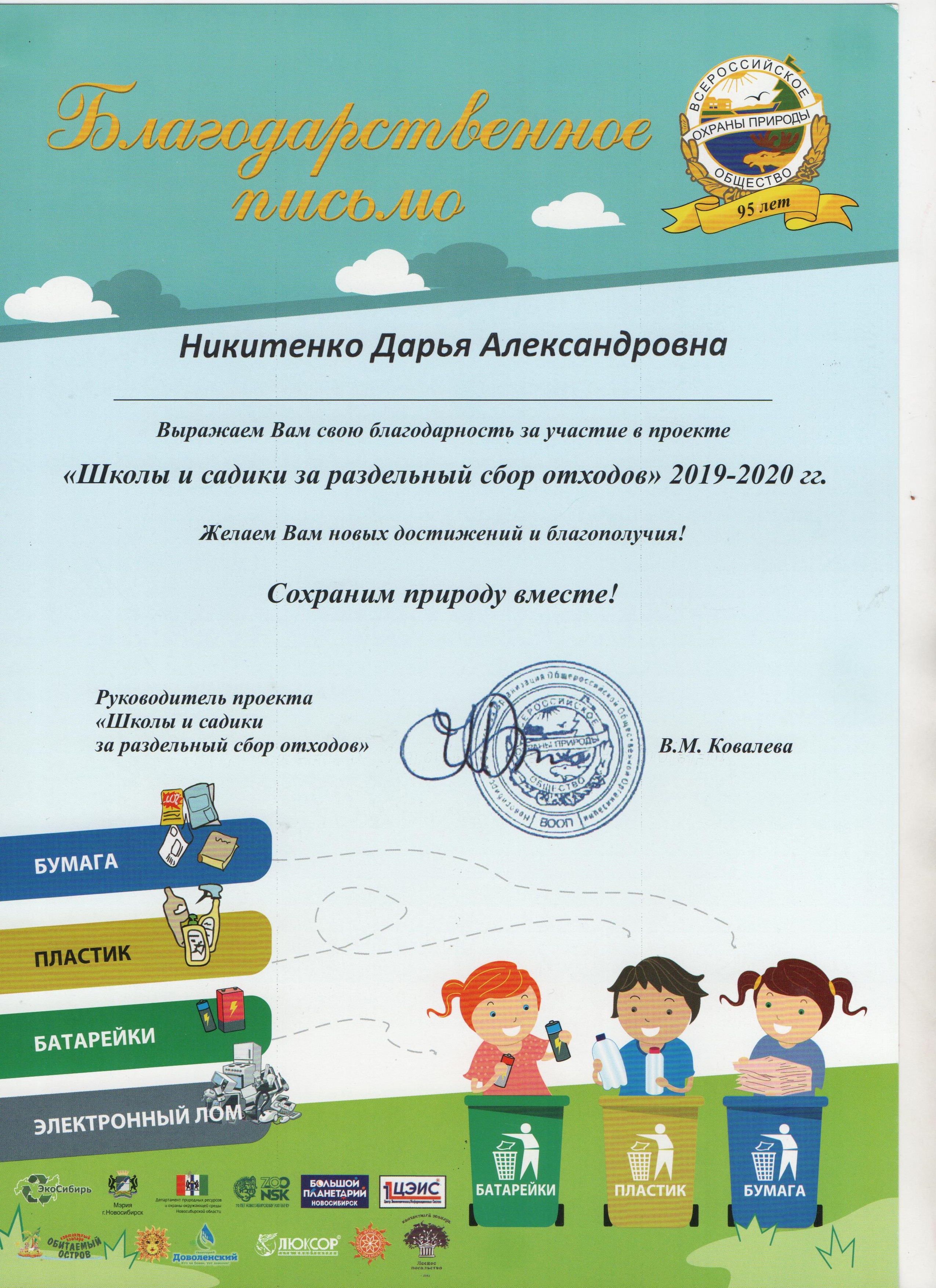 Благодарственное письмо «Школы и сады за раздельный сбор отходов» 2019-2020»