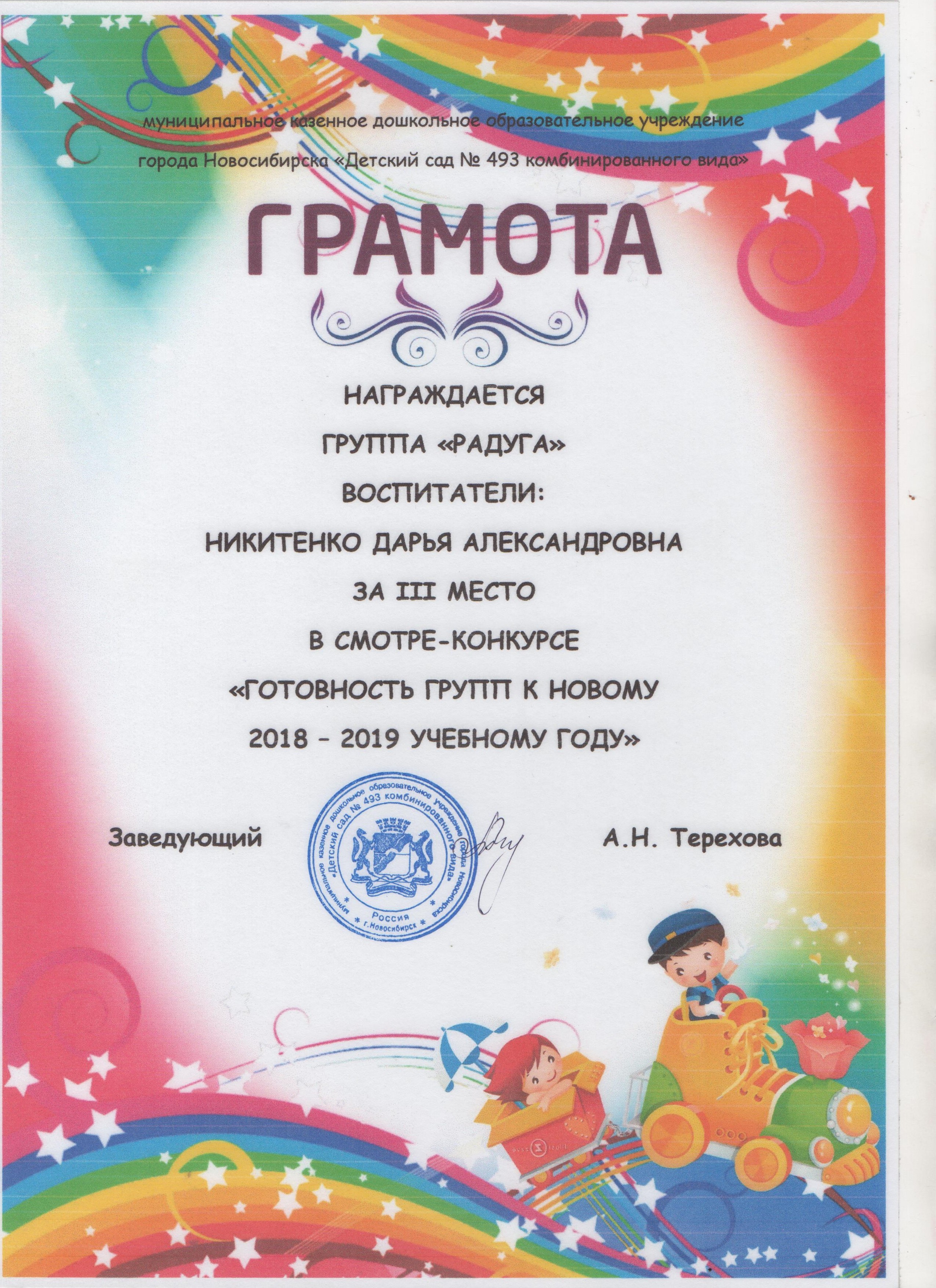 Грамота за третье место в смотре-конкурсе «Готовность групп к новому 2018-2019 учебному году»