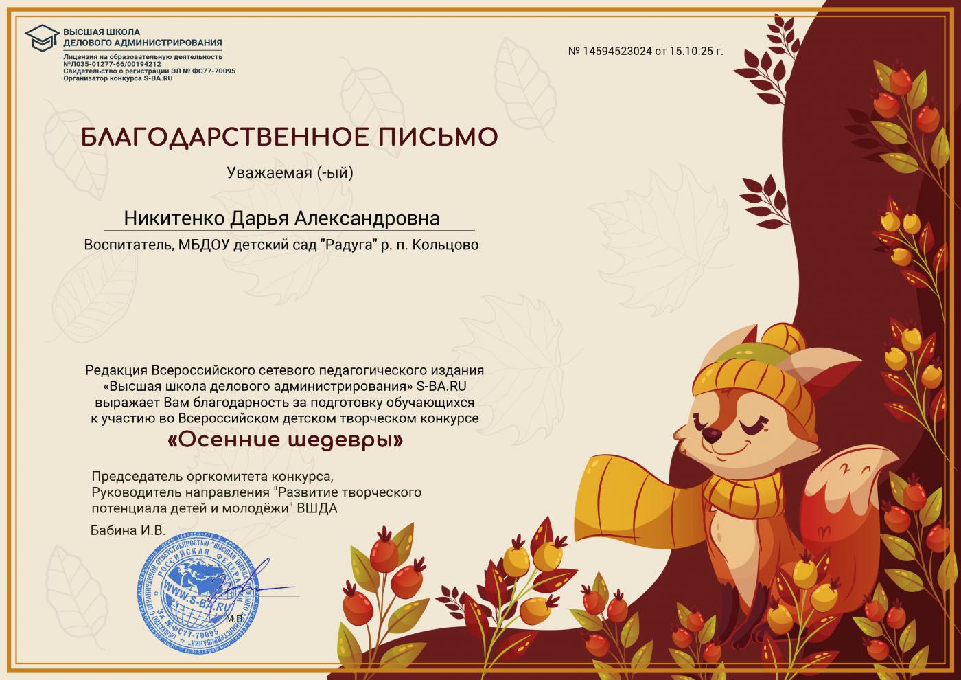 Благодарственное письмо за подготовку обучающихся к участию во Всероссийском детском творческом конкурсе «Осенние шедевры»