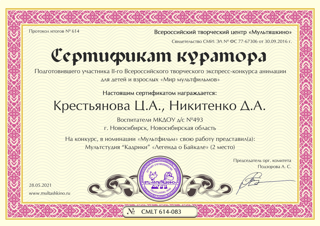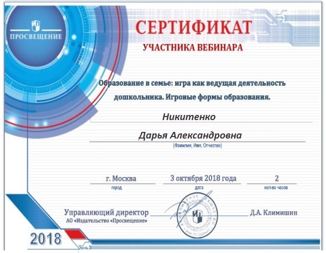 Сертификат участника вебинара «Образование в семье: игра как ведущая деятельность дошкольника. Игровые формы образования.