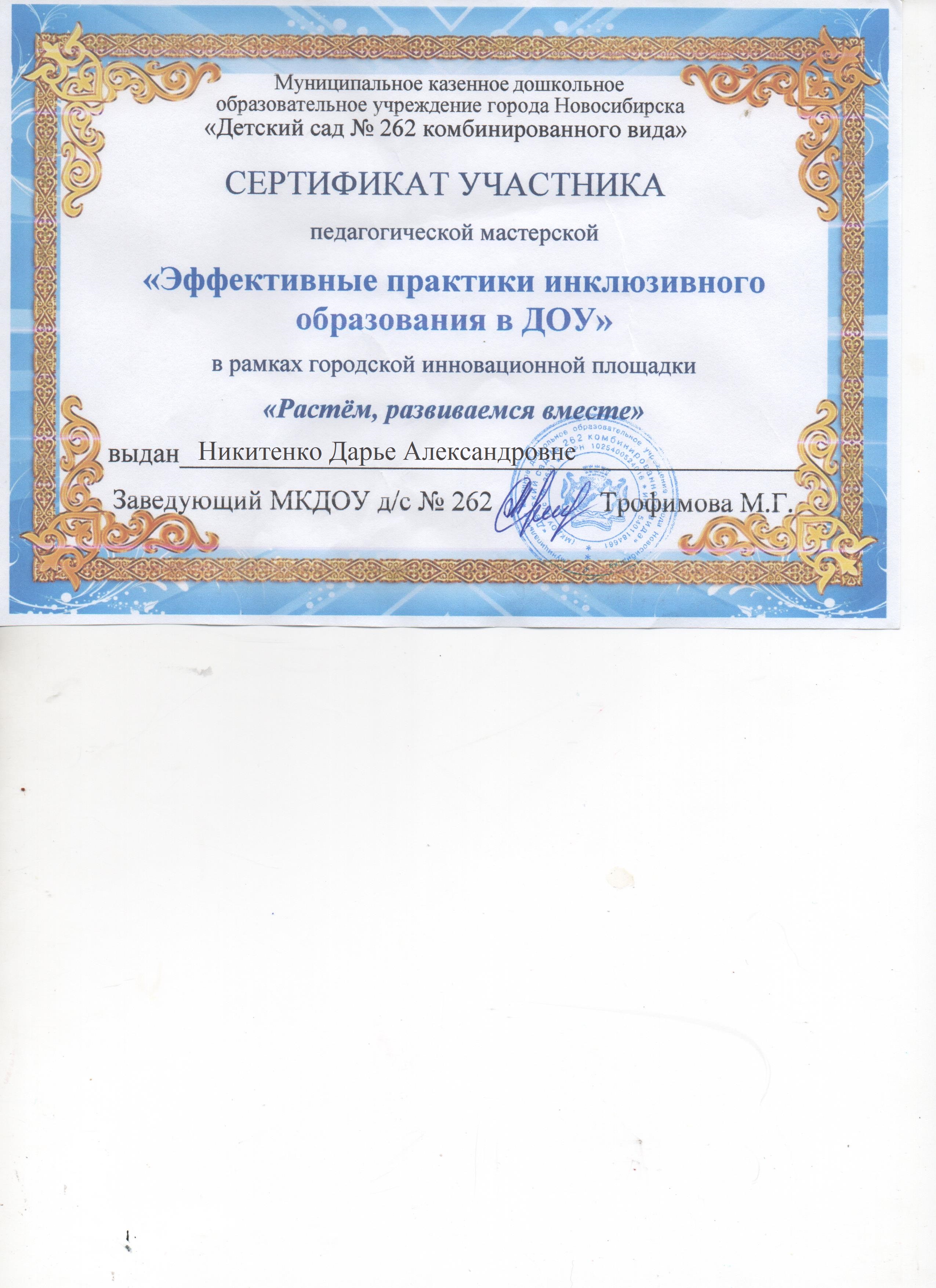 Сертификат участника «Эффективные практики инклюзивного образования в Доу»