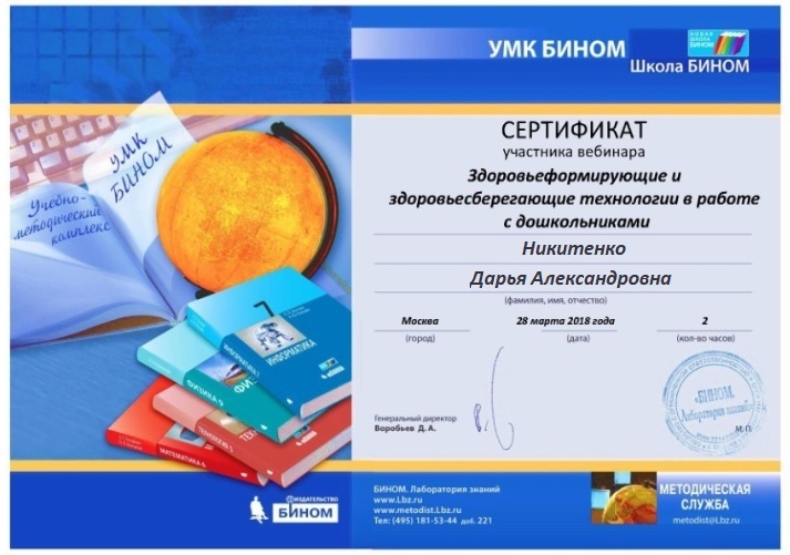 Сертификат участника вебинара «Здоровьеформулирующие и здоровьесберегающие технологии в работе с дошкольниками