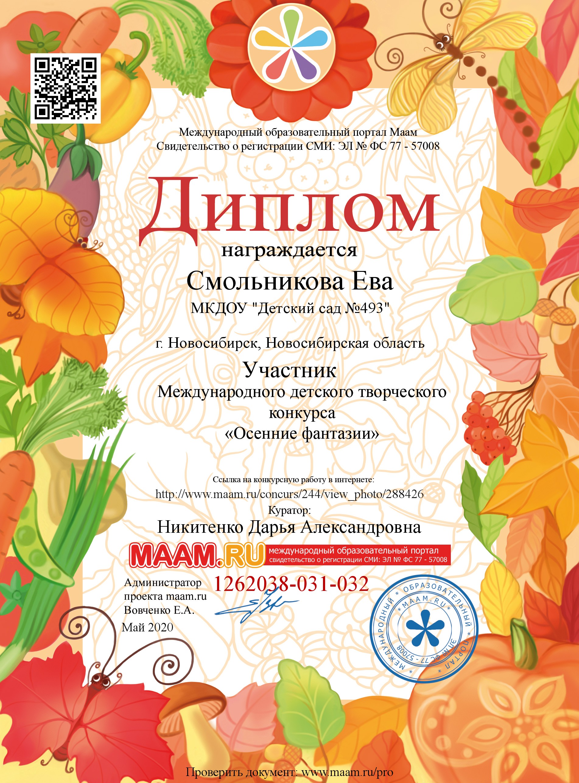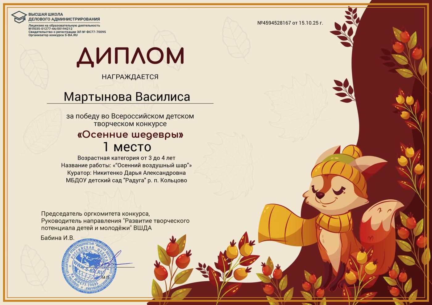 Диплом за победу во Всероссийском детском творческом конкурсе « Осенние шедевры»